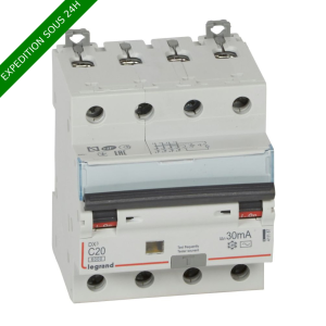 Disjoncteur différentiel monobloc DX³ tétrapolaire 400V~ pouvoir de coupure : - 6000A selon la norme NF EN 60898-1 pour applications domestiques- 10kA selon la norme EN 60947-2 Protection des départs : arrivée haute et sortie basse par bornes à vis - Type AC : détecte les défauts à composantes alternative Intensité nominale 20A - Sensibilité 30mA - 4 modules