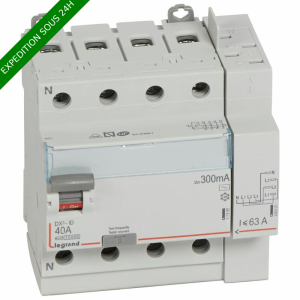 Interrupteur différentiel DX³ tétrapolaire 400V~ type AC : détecte les défauts à composante alternative Protection tête de groupe : arrivée haute par bornes à vis et sortie haute par bornes automatiques, permet la répartition optimisée par peigne Intensité nominale 40A - Sensibilité 300mA - 5 modules