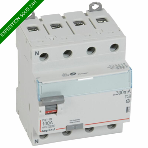 Interrupteur différentiel DX³ tétrapolaire 400V~ type A : détecte les défauts à composantes alternative et continue (circuits spécialisés : cuisinière, plaque de cuisson, lave-linge...) Arrivée haute et sortie basse par bornes à vis Intensité nominale 100A - Sensibilité 300mA - 4 modules