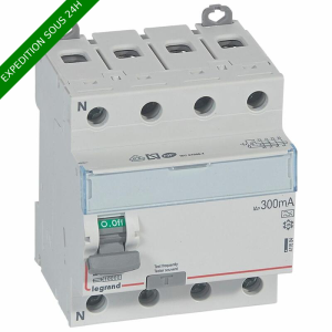 Interrupteur différentiel DX³ tétrapolaire 400V~ type A : détecte les défauts à composantes alternative et continue (circuits spécialisés : cuisinière, plaque de cuisson, lave-linge...) Arrivée haute et sortie basse par bornes à vis Intensité nominale 25A - Sensibilité 300mA - 4 modules