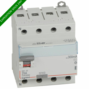 Interrupteur différentiel DX³ tétrapolaire 400V~ type AC : détecte les défauts à composante alternative Arrivée haute et sortie basse par bornes à vis Intensité nominale 25A - Sensibilité 300mA - 4 modules
