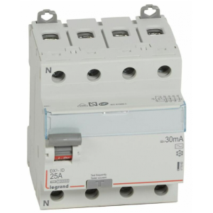 Interrupteur différentiel DX³ tétrapolaire 400V~ type AC : détecte les défauts à composante alternative Arrivée haute et sortie basse par bornes à vis Intensité nominale 25A - Sensibilité 30mA - 4 modules