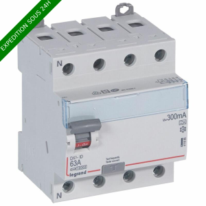 Interrupteur différentiel DX³ tétrapolaire 400V~ type A : détecte les défauts à composantes alternative et continue (circuits spécialisés : cuisinière, plaque de cuisson, lave-linge...) Arrivée haute et sortie basse par bornes à vis Intensité nominale 63A - Sensibilité 300mA - 4 modules