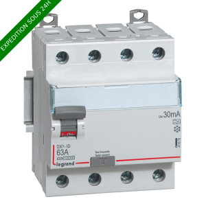 Interrupteur différentiel DX³ tétrapolaire 400V~ type A : détecte les défauts à composantes alternative et continue (circuits spécialisés : cuisinière, plaque de cuisson, lave-linge...) Arrivée haute et sortie basse par bornes à vis Intensité nominale 63A - Sensibilité 30mA - 4 modules